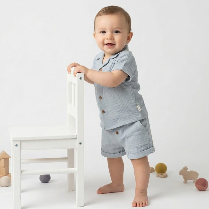 88515 GREY Baby Boys Two Piece Buttoned Shirt & Shorts Set (3-18M) Baby Boys Two Piece Buttoned S...