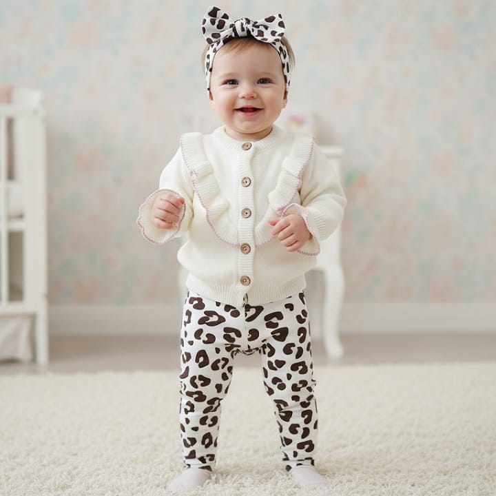 4132 cream Baby Girls Frilly Knitted Cardigan & Leopard Print Legging Set with Headband (6-36M) Baby Girls Frilly Knitted Card...
