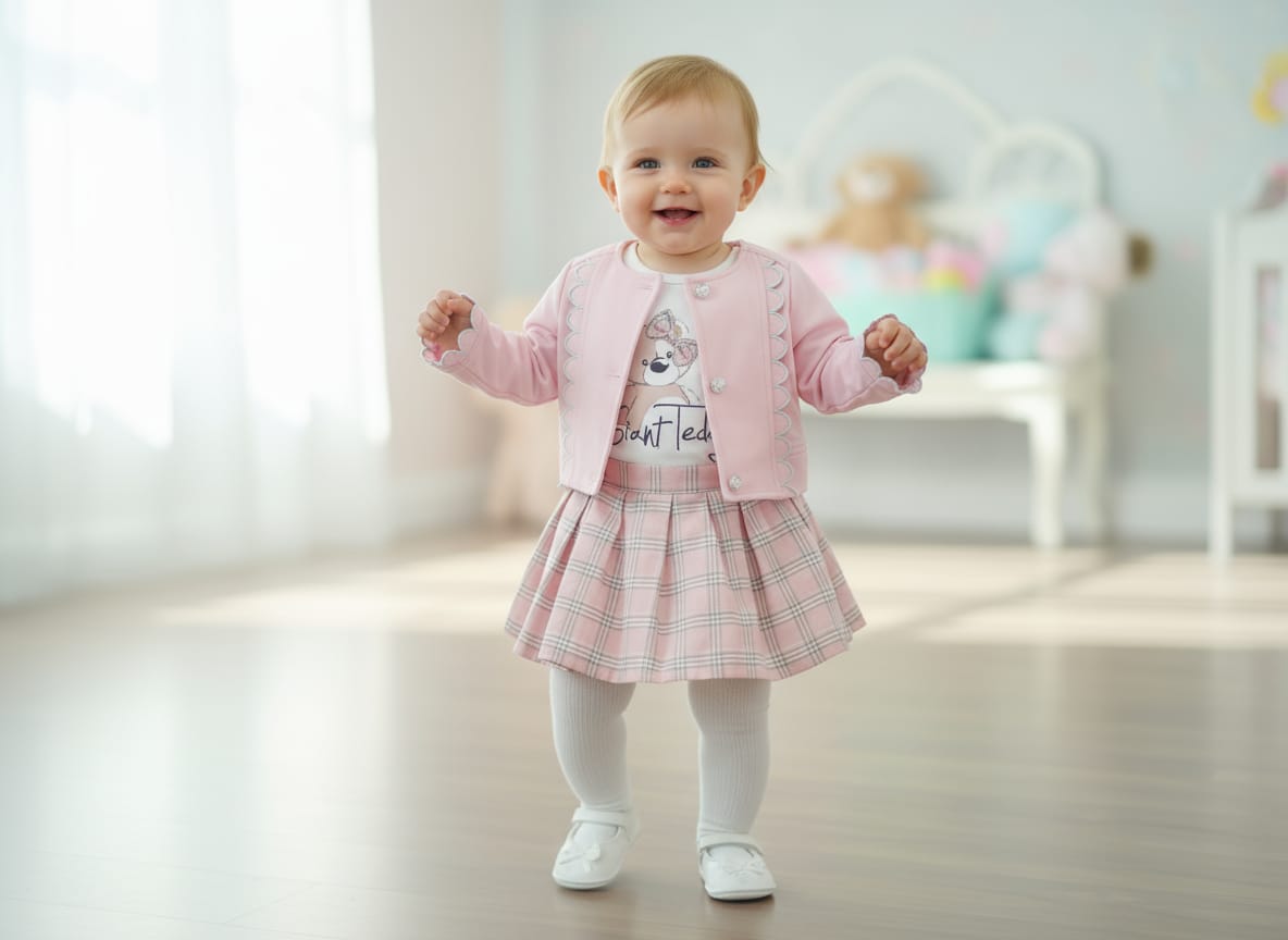 ti pink Girls Four Piece Diamante Teddy Tartan Skirt Set with Tights (2-5Y) Girls Four Piece Diamante Tedd...