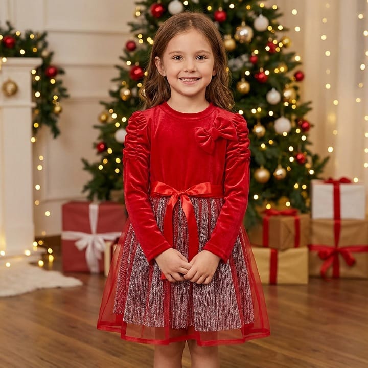 914 red Girls Full Sleeve Velvet Glitter Bow Dress (4-14Y) Girls Full Sleeve Velvet Glitt...
