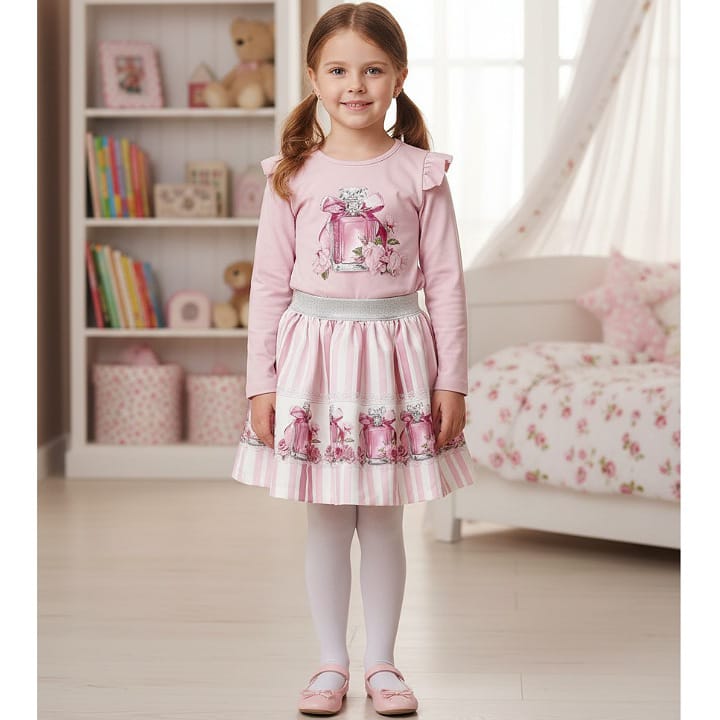 perfume pink Girls Perfume Print Pearl Diamante Top & Skirt Set (1-8Y) Girls Perfume Print Pearl Diam...