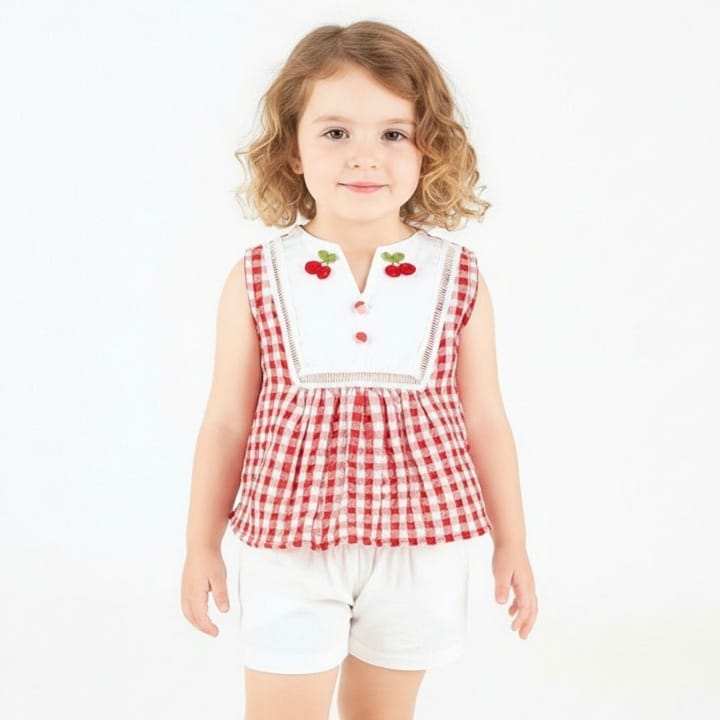 1185 red Girls Two Piece Check Cherry Embroidered Top & Shorts Set (1-4Y) Girls Two Piece Check Cherry E...