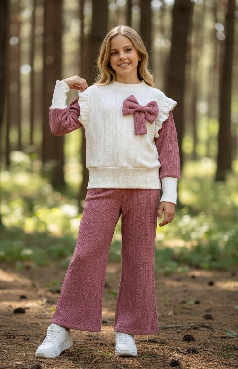 bow pink Girls Two Piece Embossed Bow Lounge Wear Set (4-12Y) Girls Two Piece Embossed Bow L...
